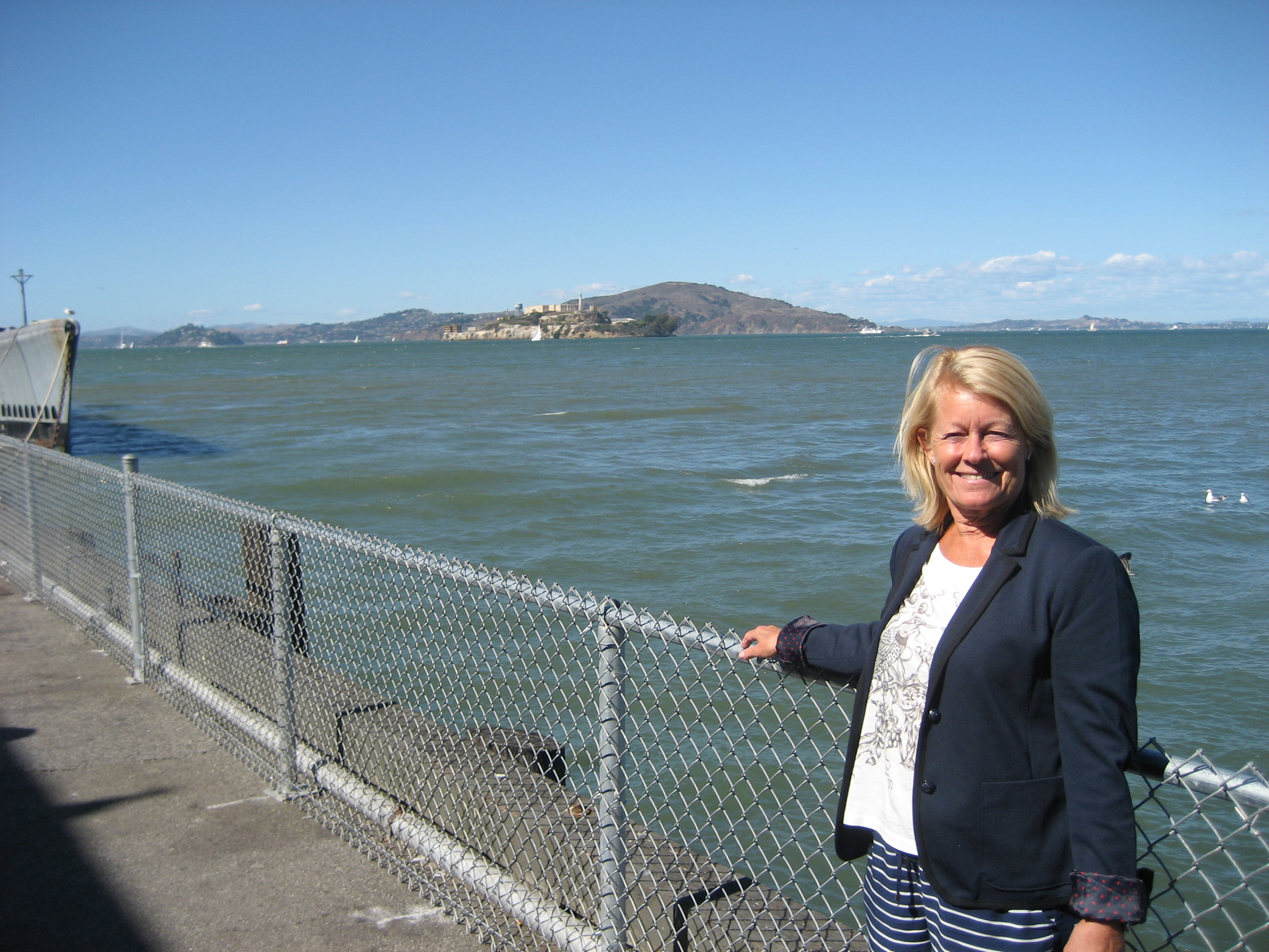 Lombard Street ska vara världens krokigaste gata. Så slingrande. Vackra planteringar längs hela gatan.Skön promenad vid vattnet och på avstånd syns Alcatraz.Lite närmare Alcatraz än så här kom vi aldrig. Det här stora hjulet hade hamnat på land, för reparation kanske eller var det bara en turistgrej.